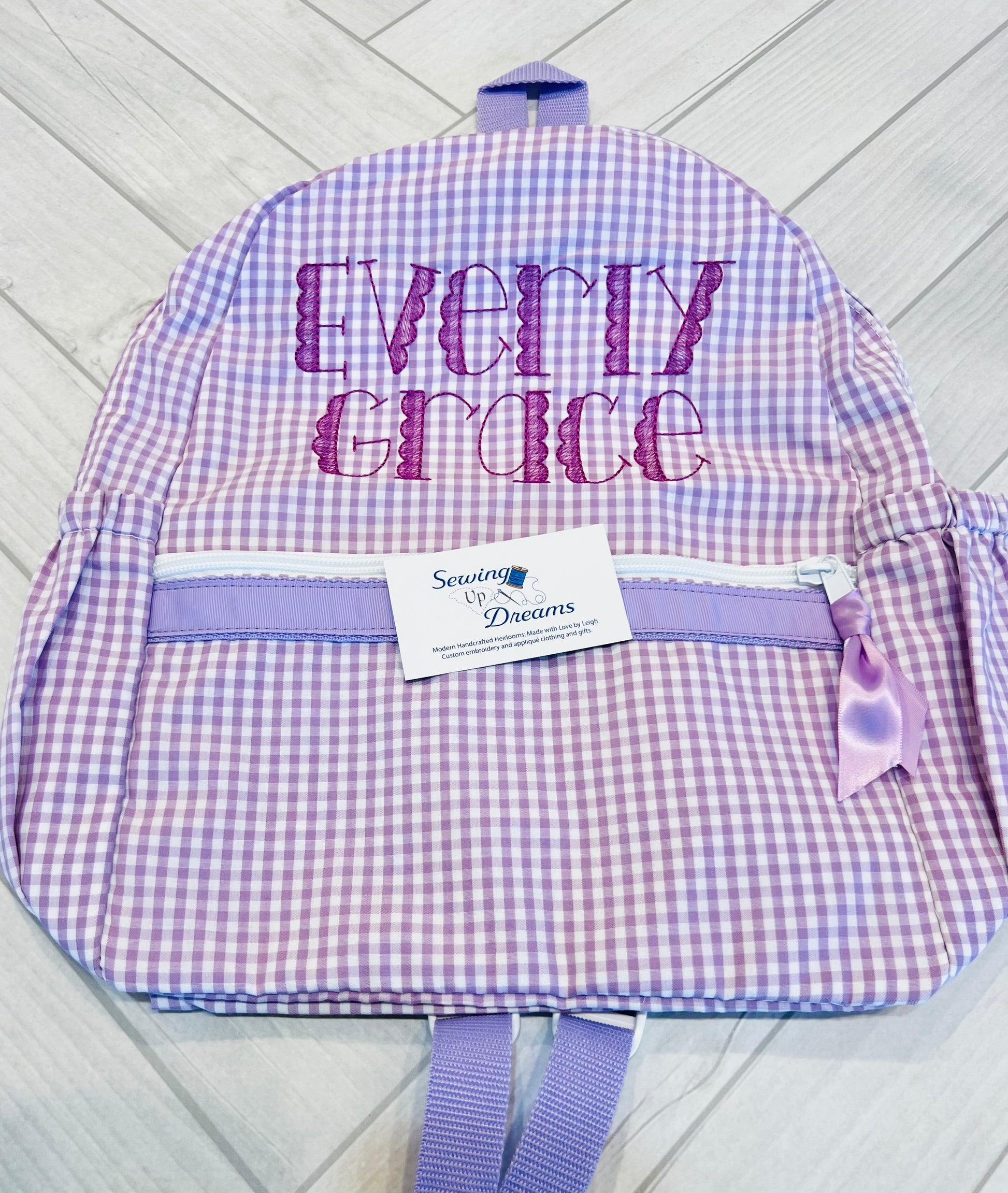This adorable backpack has a side pocket on each side! With plenty of room for books and folders. Children as young as 3 can handle this bag if they are required to carry a folder from school to home each day, but it will fit kids all the way up to tween size. This backpack makes for the perfect diaper bag, overnight bag and take to church. Definitely a bag that will grow with any child. Add a name or initials for an extra special touch! The dimensions of this bag are 15" x 15" x 6"