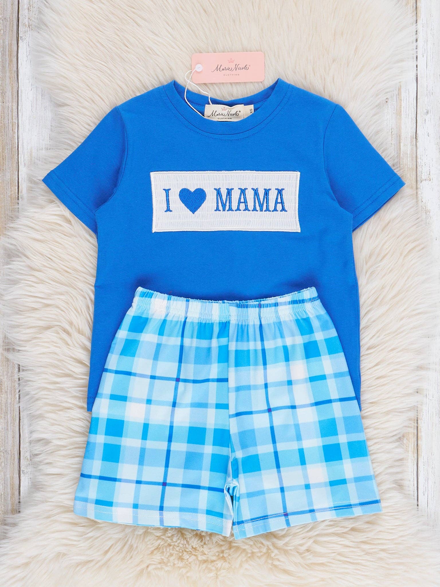 Get ready for summer with our Mama Love Smocked Plaid Outfit! This adorable boys' shorts set features blue plaid shorts paired with a blue top boasting an embroidered "I ❤️ MAMA" over smocking. Perfect for brothers, this set from Marie Nicole Clothing is sure to show some mama love.