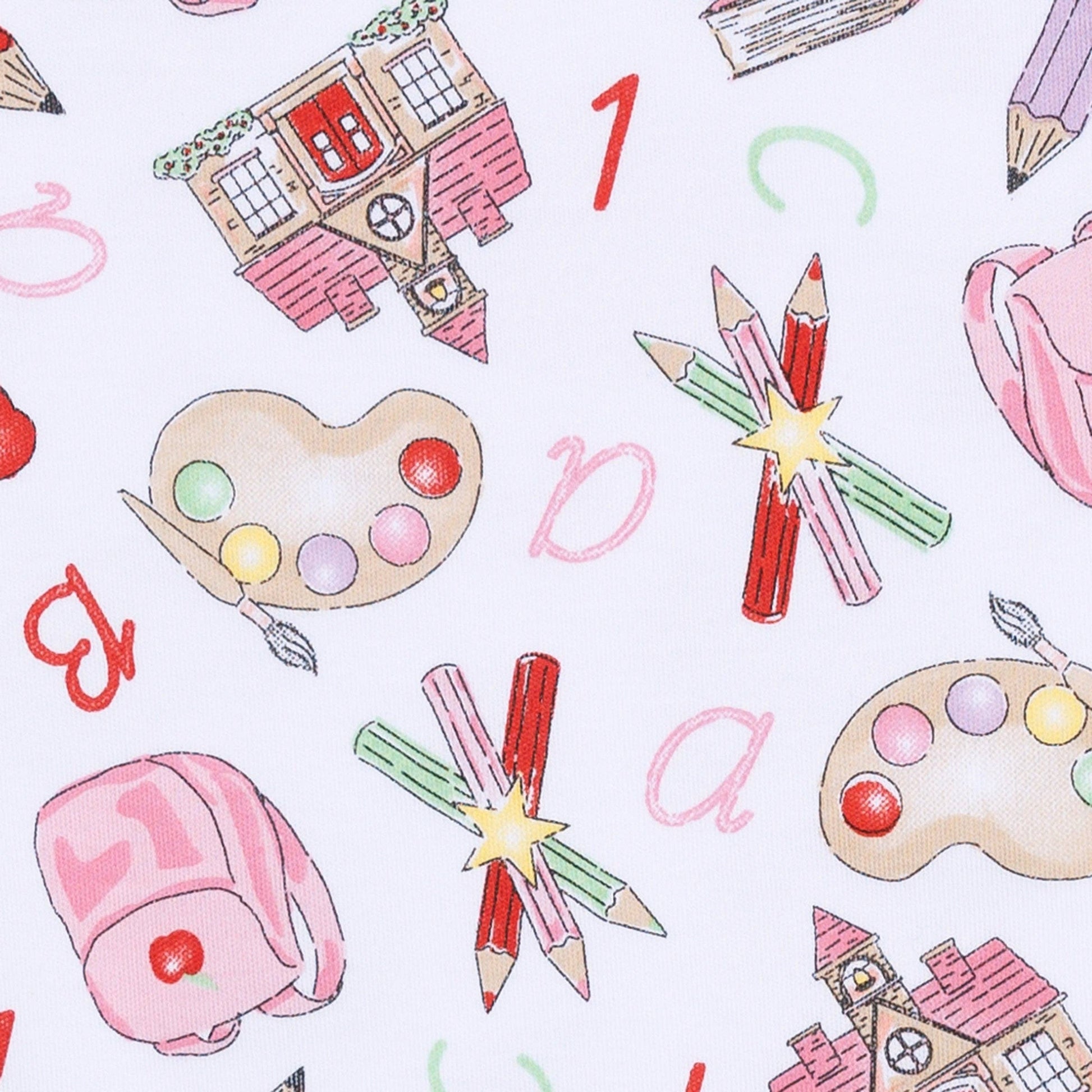 Magnolia Baby School Day Sweetness Collared Short Sleeve Dress - Pink Dress your little one in charming style with our School Day Sweetness Collared Short Sleeve Dress! Inspired by back-to-school fun and school life, this adorable dress features a delightful school supply print on luxurious Pima cotton, perfect for your little girl.