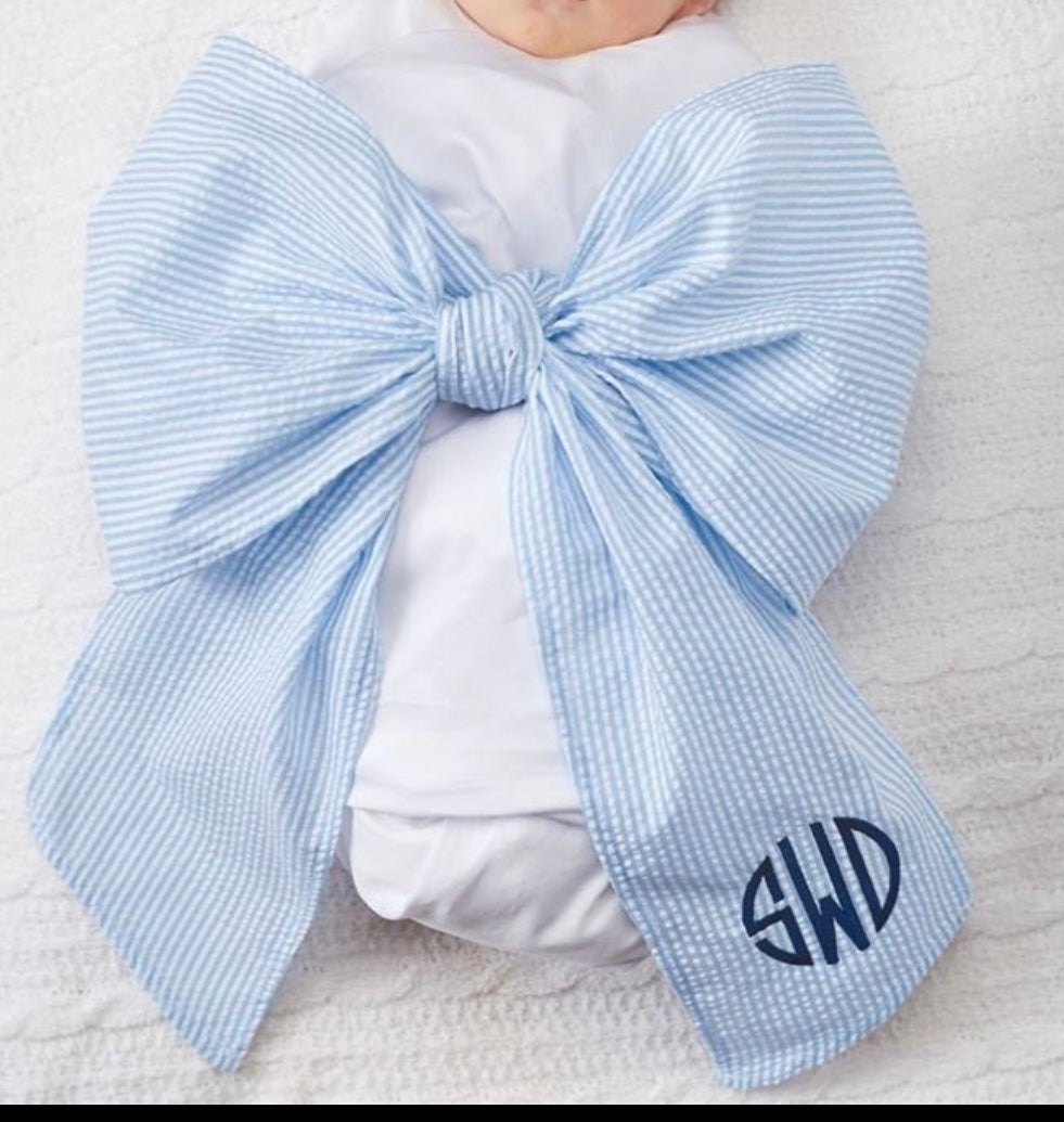 There is simply no cuter way to bundle up baby than with our fabulous Seersucker Swaddle Blankets! Soft, 100% cotton and classically finished out with a bow, they make for beautiful and handsome newborn photographs or the perfect bundle for his/her debut.